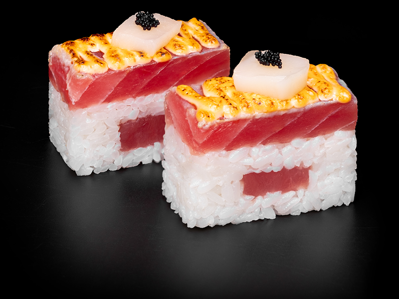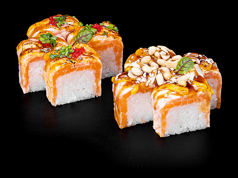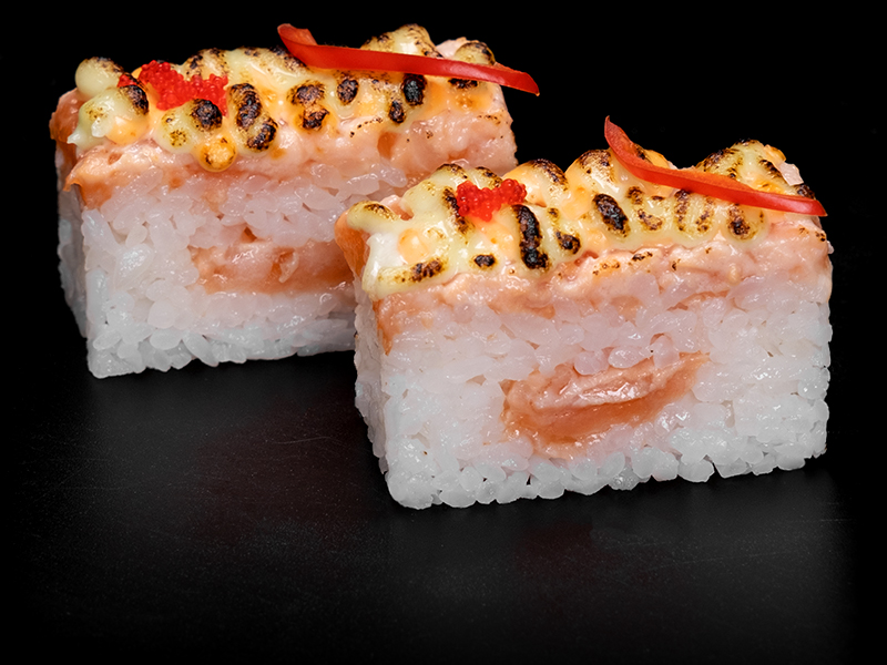 Опалённый фарерский лосось в восхитительном сочетании с тигровой креветкой. Внутри спрятано облако отборного японского риса и фирменный соус Васабико. Венчает это великолепие икра лосося и микрозелень, 5 шт.