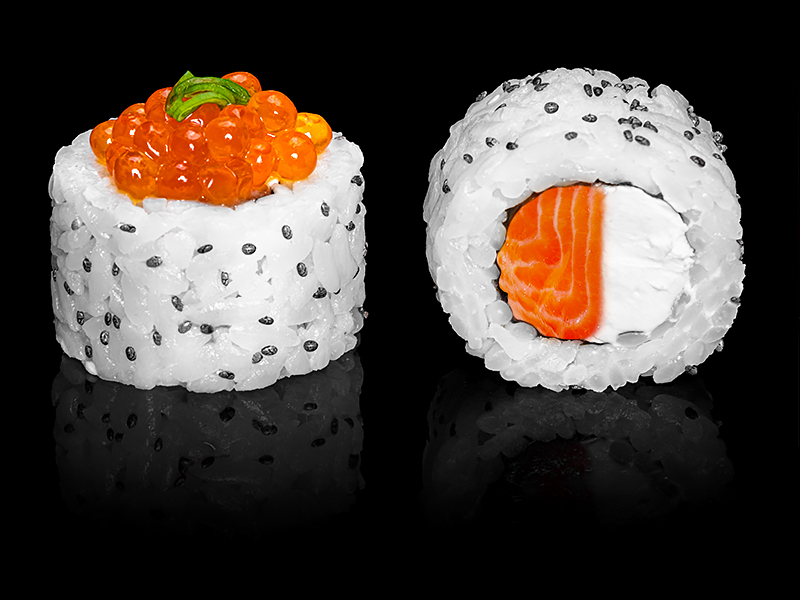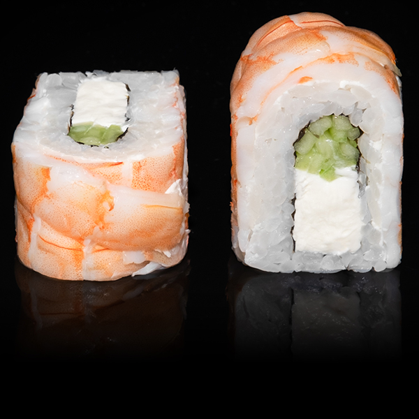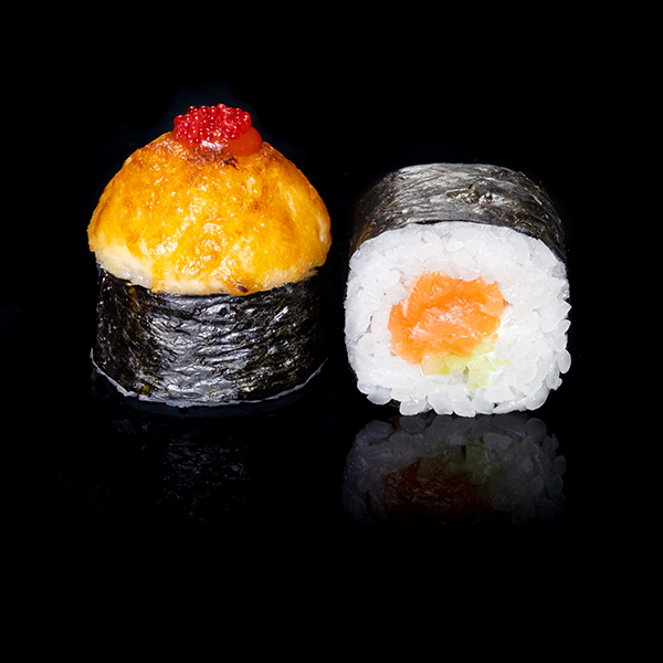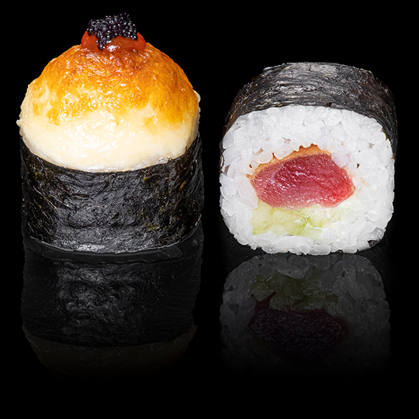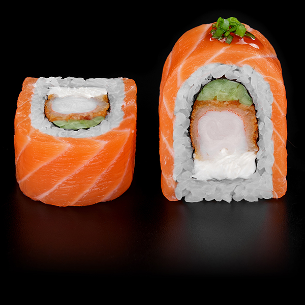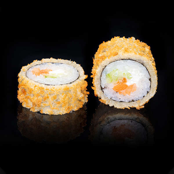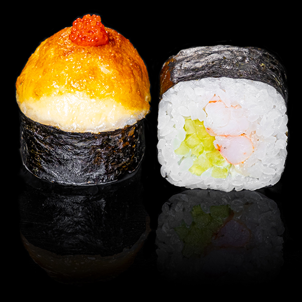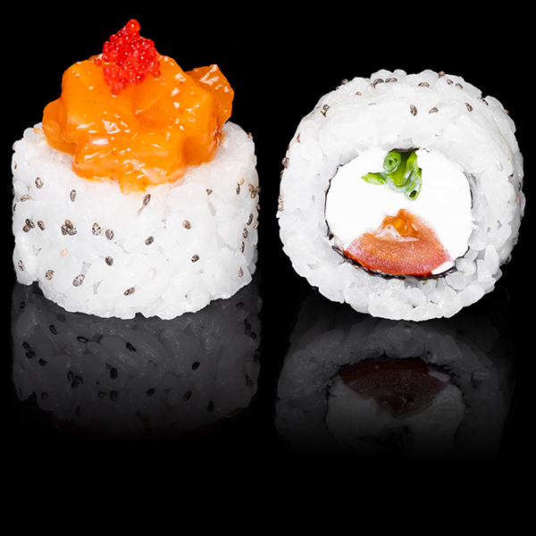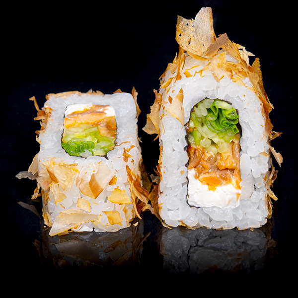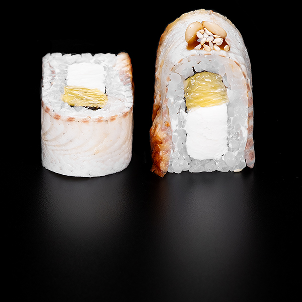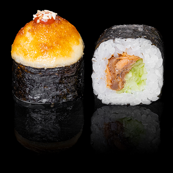 Безупречное сочетание опаленного на открытом огне фарерского лосося, королевской креветки в темпуре и конкассе из свежего огурчика. Особую нежность композиции придает сливочный Cremette. Венчает ансамбль ингредиентов капля соуса «Васабико» и икра летучей рыбы. 8 шт