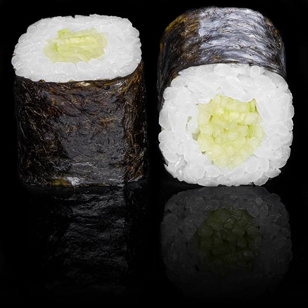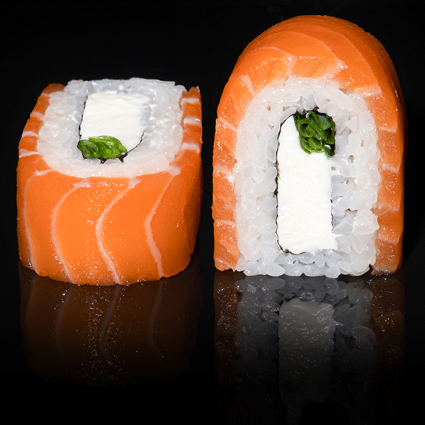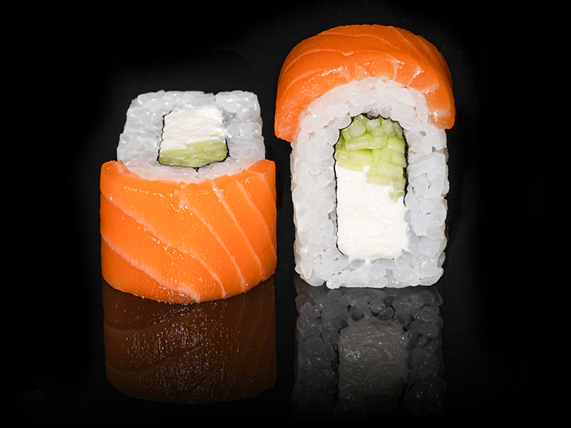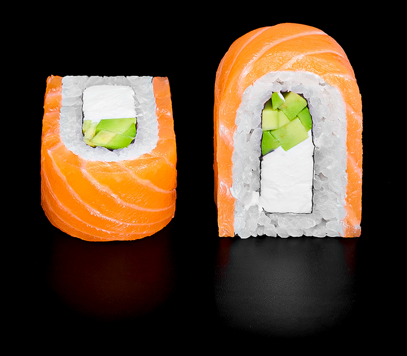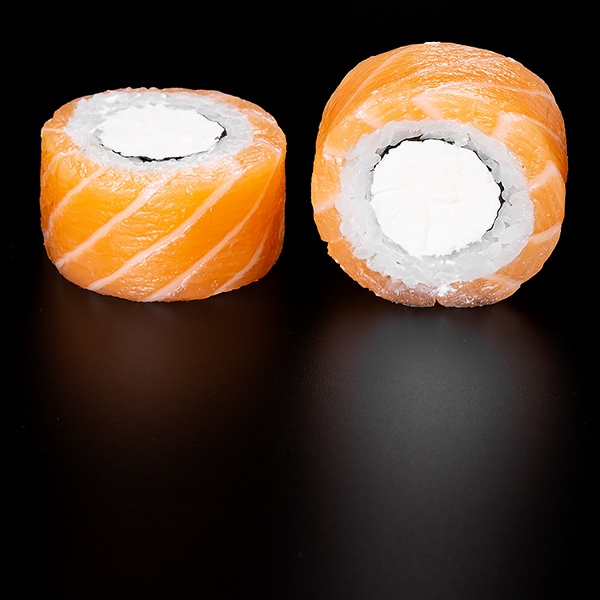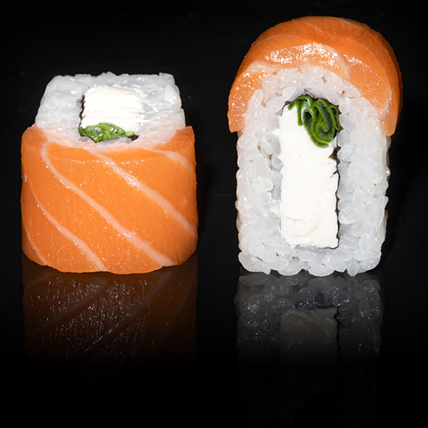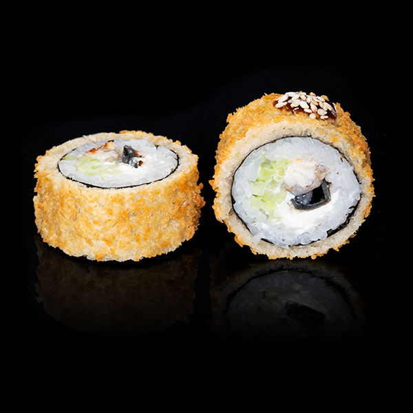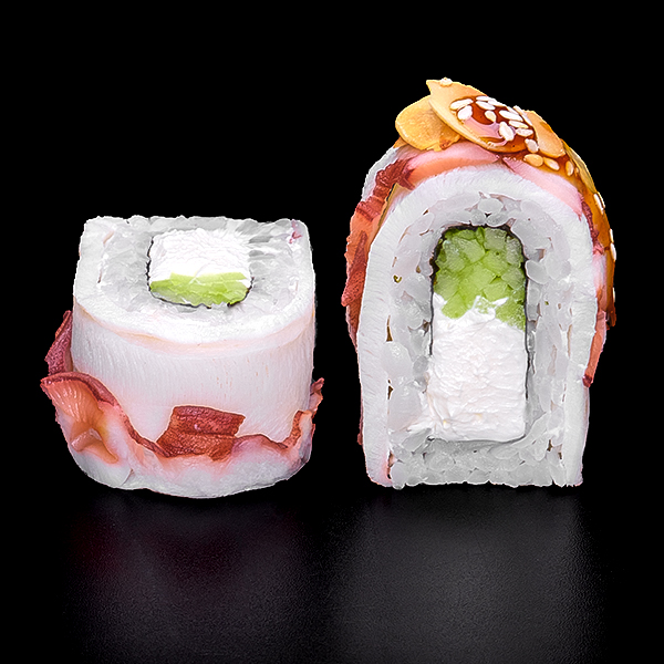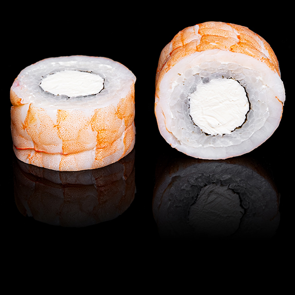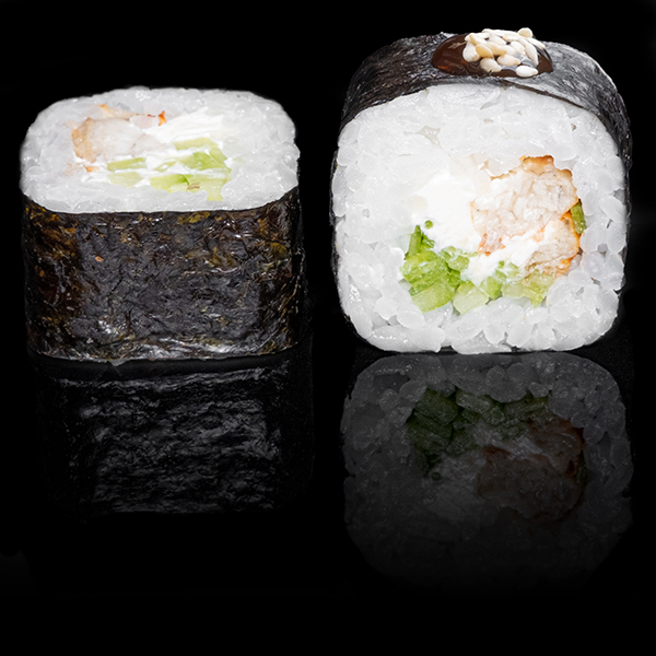 Безупречное сочетание опаленного на открытом огне фарерского лосося, королевской креветки в темпуре и конкассе из свежего огурчика. Особую нежность композиции придает сливочный Cremette. Венчает ансамбль ингредиентов капля соуса «Васабико» и икра летучей рыбы. 8 шт