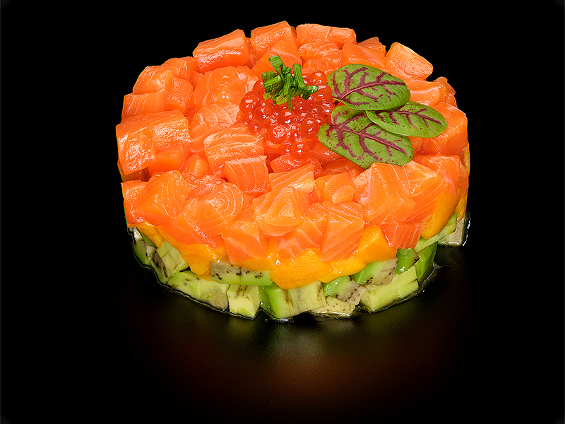 На мелко нарезанных кусочках спелого авокадо и зеленого огурчика располагается грациозный ансамбль из тигровых креветок и филе камчатского краба. Подается с фирменным соусом.