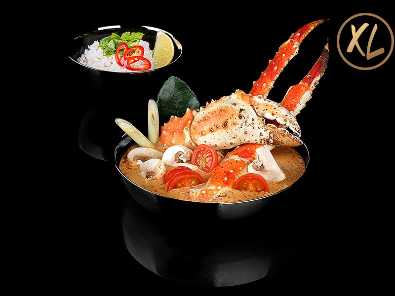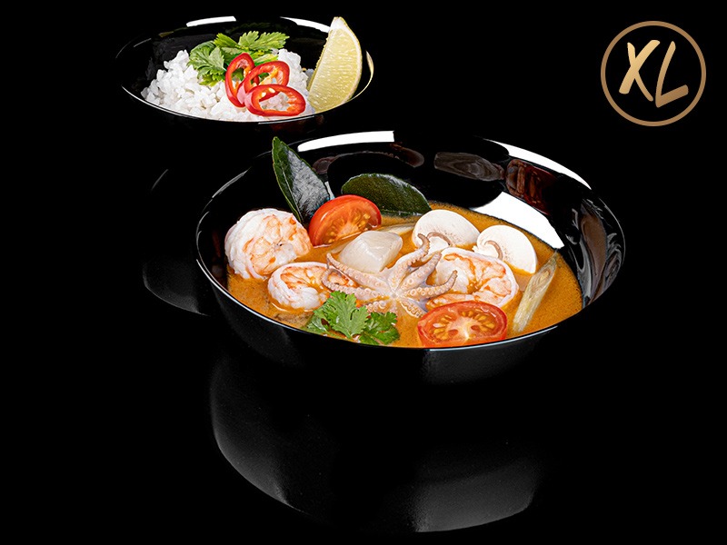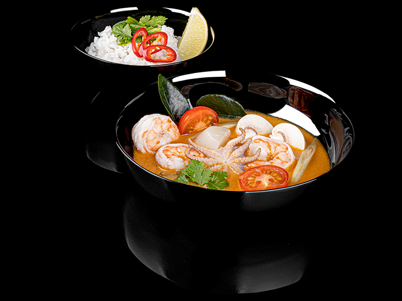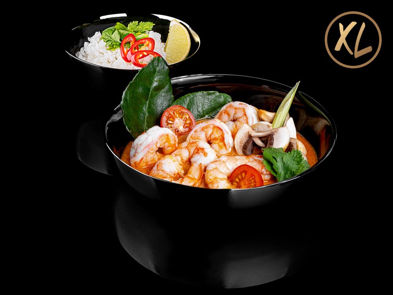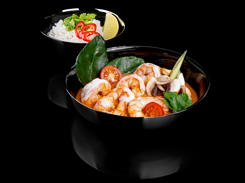 Фирменный суп на кокосовом молоке с отборными тигровыми креветками. Так же входят: свежие шампиньоны, лемонграсс, лист лайма, кинза, помидорки черри, перец чили, лайм.