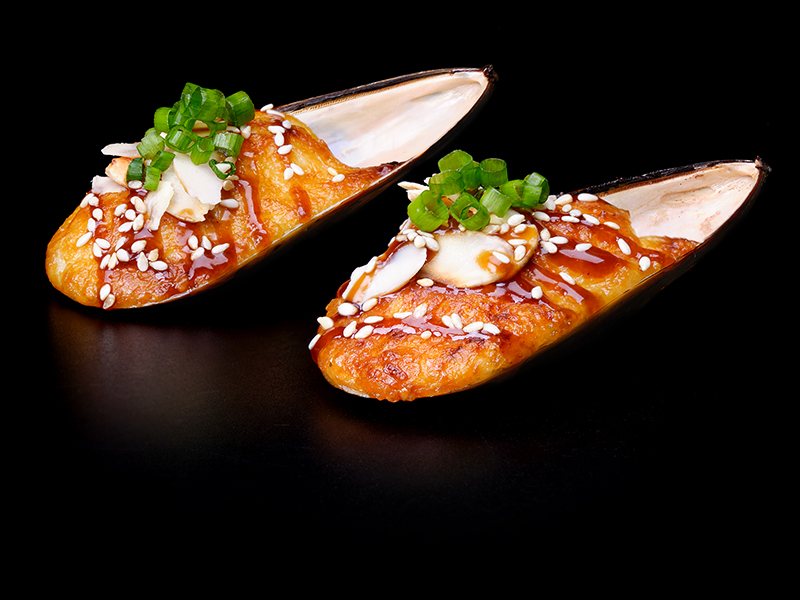 Цельные мидии укрыты нежнейшей запеченной сырной шапкой. Верх композиции венчают лепестки миндаля и зеленый лук, под соусом Унаги. 6шт